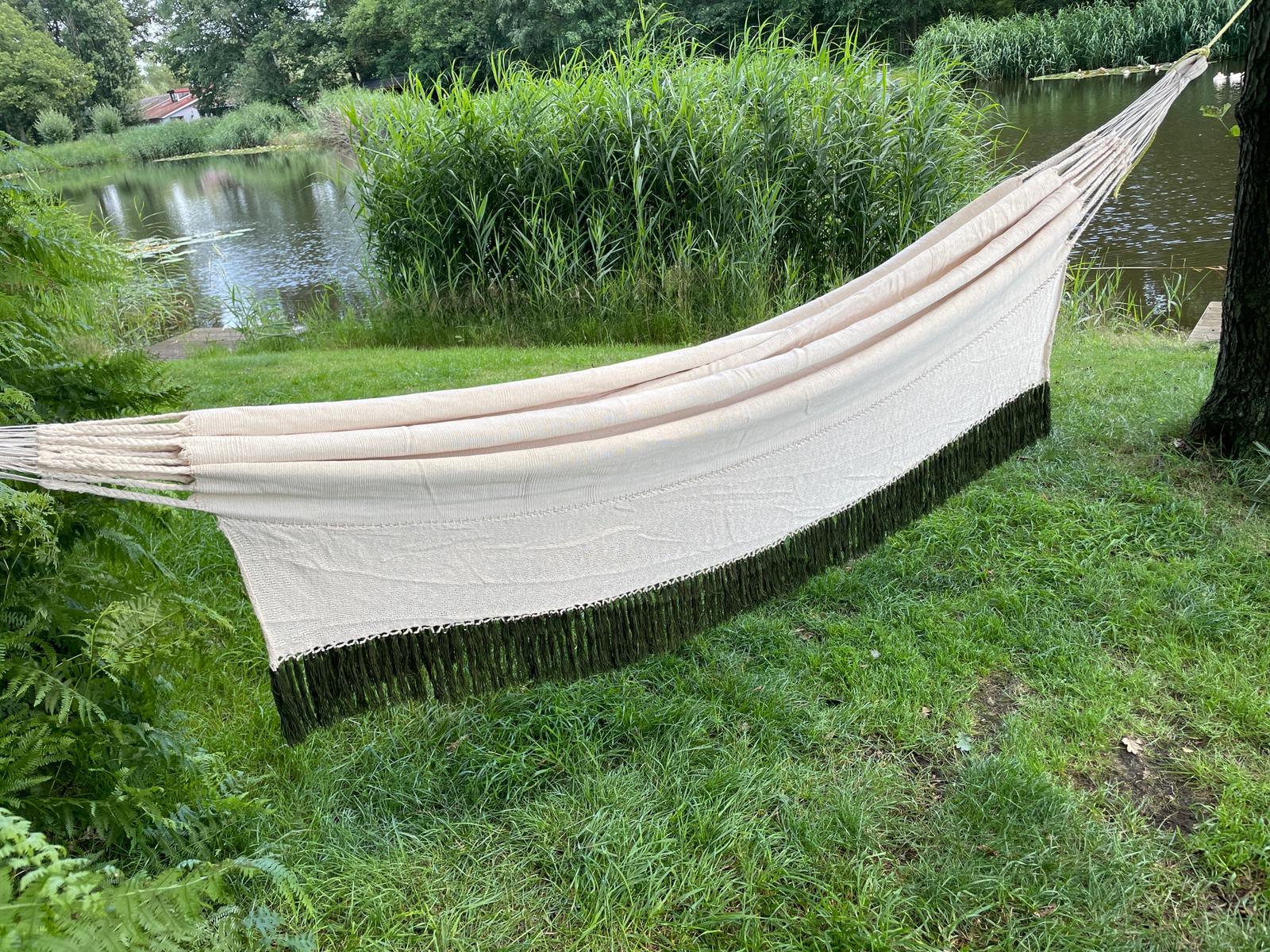 Hangmatten San Jacinto is er trots op met zo een fantastische groep weefsters te kunnen werken en dat al 25 jaar tot wederzijds genoegen. Nergens in Colombia vindt men dit type hangmat in deze kwaliteit en in deze grote maatvoering. De hangmatten worden stuk voor stuk met de hand gemaakt en dat maakt ze allen unique. Elke hangmat is anders, zowel wat betreft de kleuren, de geometrische figuren als ook de kleur van de franje. Het zijn stevige hangmatten, die zowel voor een persoon als twee persoons te bestellen zijn. Wij raden wel aan om ze niet bloot te stellen aan fel zonlicht of regen. Onze weefsters verven zelf de ongebleekt katoenen garen, waardoor ze een heel intense kleurstelling hebben. Daardoor zijn deze hangmatten heel decoratief en geven zij warmte aan elk interieur of terras.
